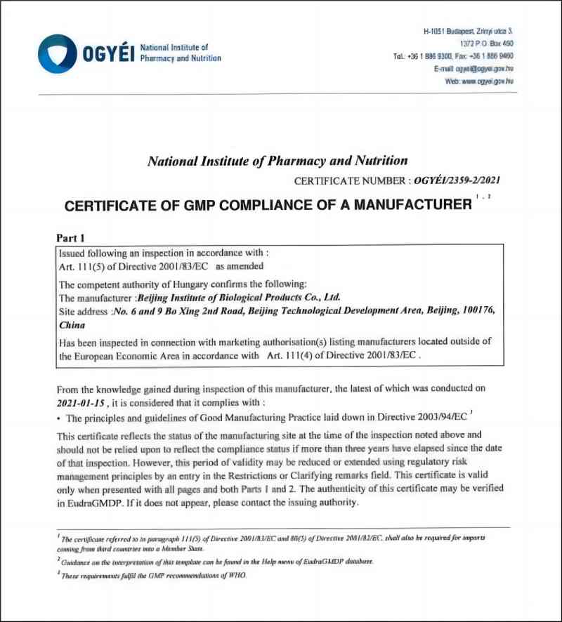 1月13至15日,匈牙利國立藥學(xué)與營養(yǎng)研究所對國藥集團中國生物北京生物制品研究所進行了相關(guān)的GMP審計。經(jīng)過嚴格審計與綜合判定,匈牙利國立藥學(xué)與營養(yǎng)研究所認為,國藥集團中國生物北京生物制品研究所生產(chǎn)的新冠滅活疫苗符合歐盟標準,并允許應(yīng)急使用。3月3日,國藥集團中國生物北京生物制品研究所向匈牙利藥監(jiān)部門提交了相關(guān)后續(xù)報告。4月1日,按照歐盟監(jiān)管標準和規(guī)則,匈牙利國家藥品審批監(jiān)管機構(gòu)正式向國藥集團中國生物北京生物制品研究所頒發(fā)新冠滅活疫苗歐盟通用GMP證書。